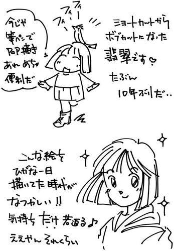 ここのところ、昔のイラストマンガを引っ張ってきてるんですが、 このときショートカットだったんですよね~ で、ボブになった現在を描いてみました。 描くっていうと、年末のPOPオンパレードが一段落。 また品物が入ってきたら、それぞれ描くんですが・・・…