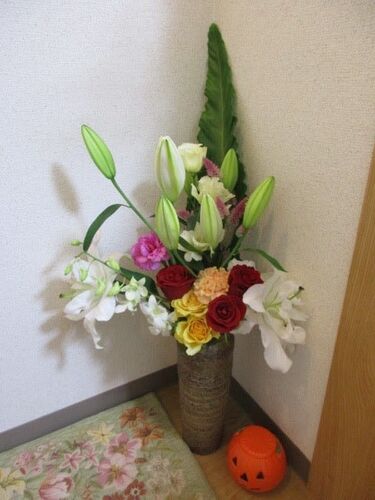 10月も終わり 久々にガッツリな開店花GETです☆ 近所に居酒屋がオープンしました。 こじんまりした店ですが、けっこうドカンと 開店花が飾ってありました。 玄関棚スペースにも少し飾りました。 白い百合か、カサンブランカか、わかりませんが、 パパパ…